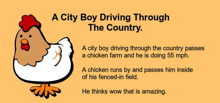 A city boy driving through the country passes a chicken farm and he is doing 55 mph.