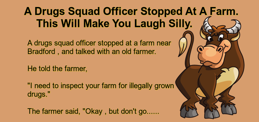 A short time later, the old farmer heard loud screams, looked up, and saw the drugs squad officer running for his life, being chased by the farmer’s big ferocious-luking bull……