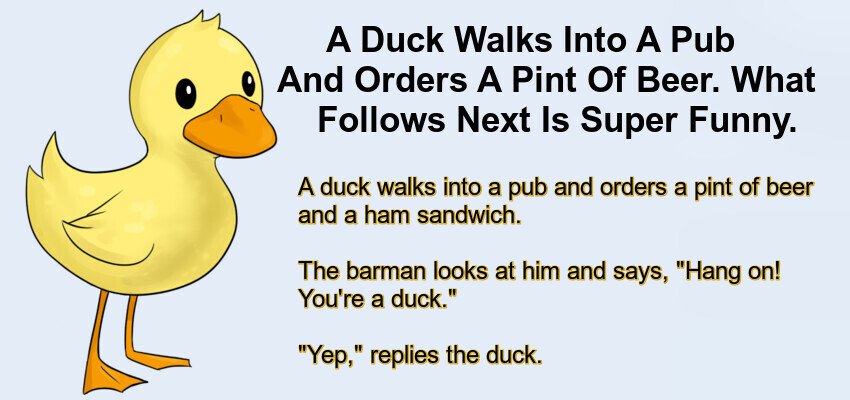 “Certainly, sorry about that”, says the barman as he pulls the duck’s pint. “It’s just we don’t get many ducks in this pub. What are you doing round this way?”