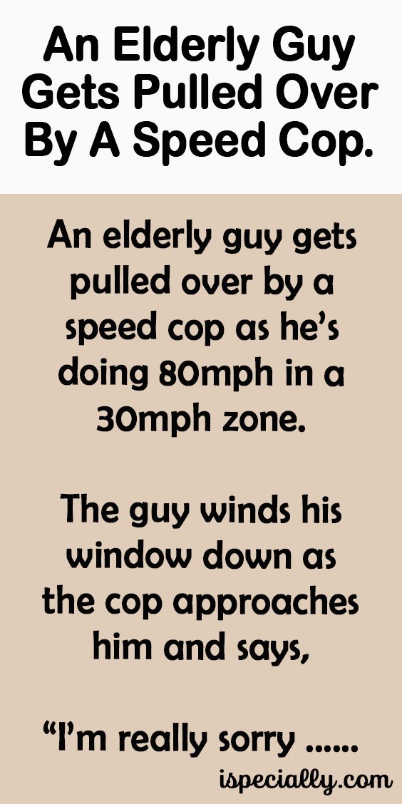 An elderly guy gets pulled over by a speed cop as he’s doing 80mph in a 30mph zone.
