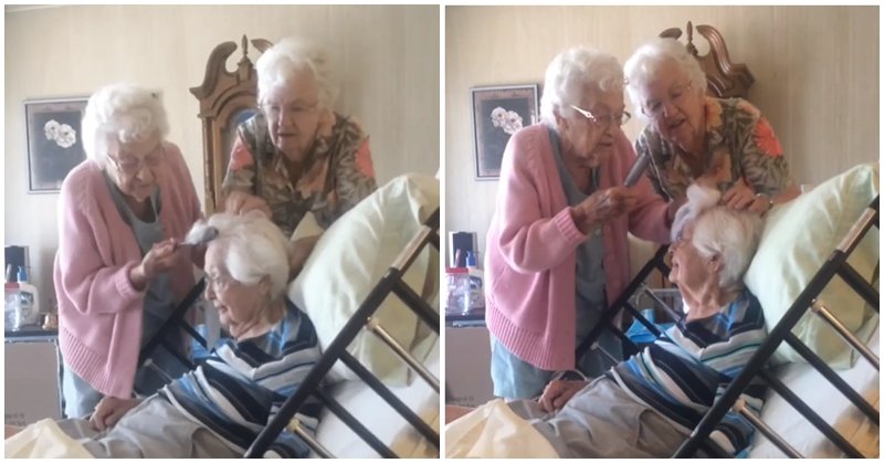 Hauff’s grandma with her two sisters. [Left] The sisters gently brush her hair. [Right] | Photo: facebook.com/NTDTelevisionAU