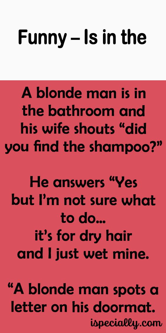 A blonde man is in the bathroom and his wife shouts “did you find the shampoo?”