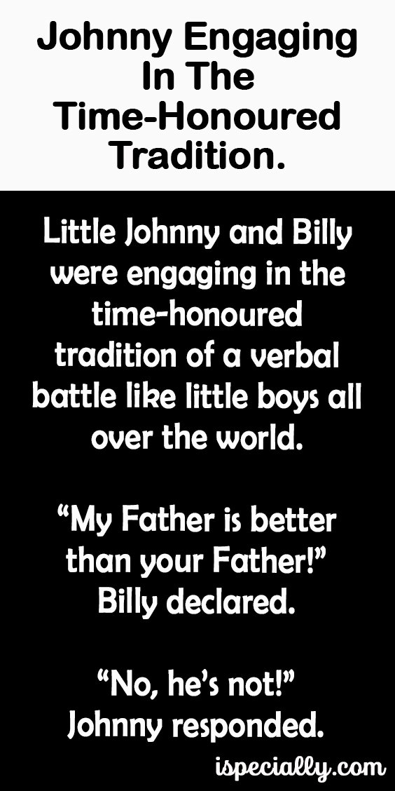 Little Johnny and Billy were engaging in the time-honoured tradition of a verbal battle like little boys all over the world.