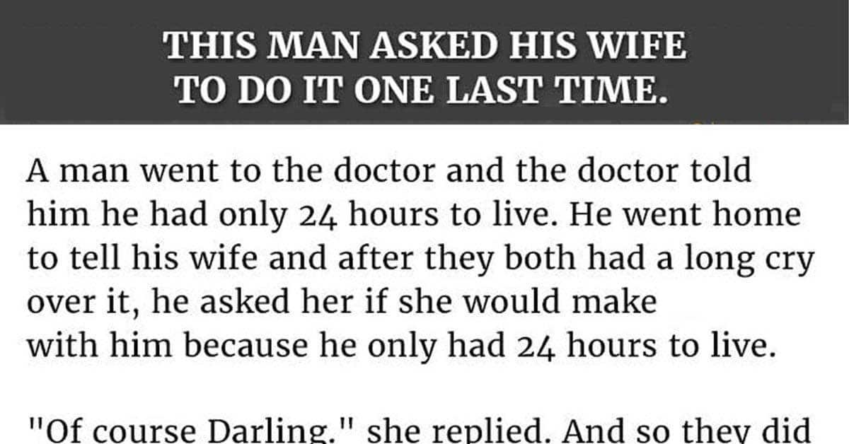 A man went to the doctor and the doctor told him he had only 24 hours to live. He went home to tell his wife and after they both had a long cry over it, he asked her if she would make love with him because he only had 24 hours to live.