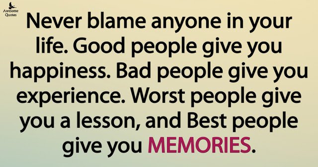 Never blame anyone in your life. Good people give you happiness. Bad people give you experience. Worst people give you a lesson, and Best people give you MEMORIES.