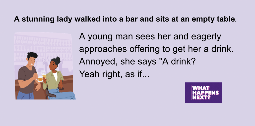 A stunning lady walked into a bar and sits at an empty table.