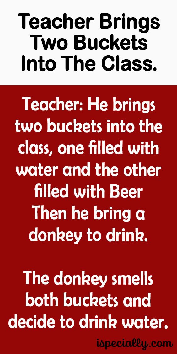 Teacher: He brings two buckets into the class, one filled with water and the other filled with Beer