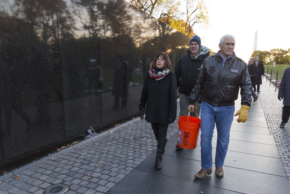“Moving start to Veterans Day,” Pence wrote in a tweet later that day. “Thanks to [New Day USA] volunteers who joined [National Park Service], [Zinke], Karen & me to clean the Vietnam Veterans Memorial. Also inspiring to meet NPS ranger & veteran James Pierce. To all Veterans, we are grateful for your service & sacrifice.”