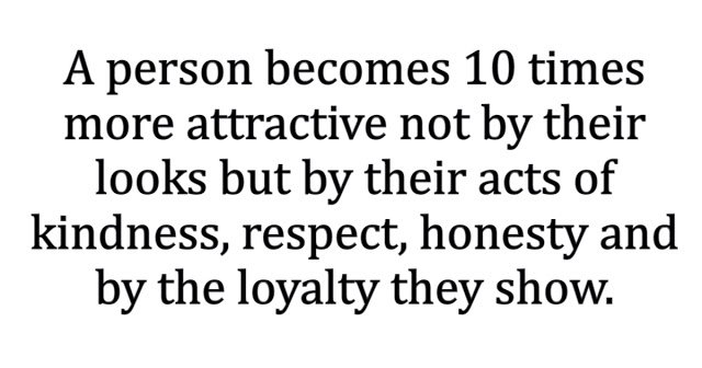A person becomes 10 times more attractive not by their looks but by their acts of kindness, respect, honesty and by loyalty they show.